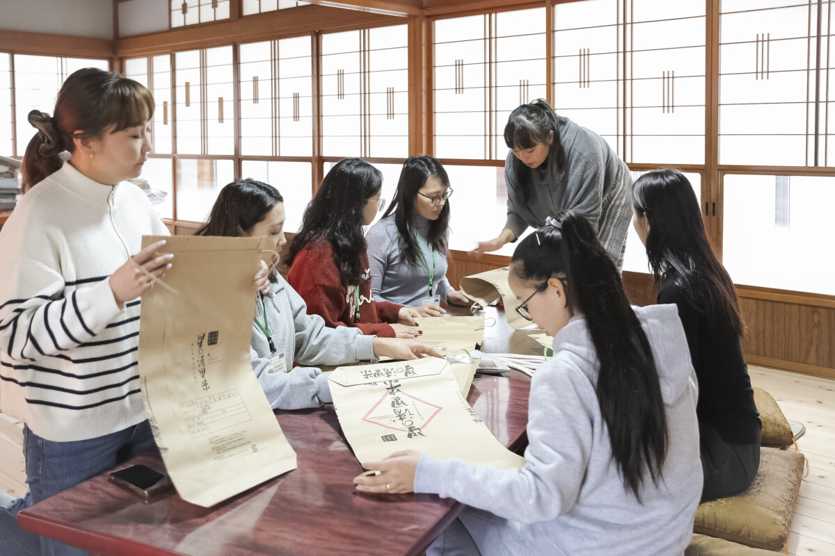 この日はモンゴルからのお客様のグループが宿泊中。米袋を使ったトートバッグの制作体験が行われていました